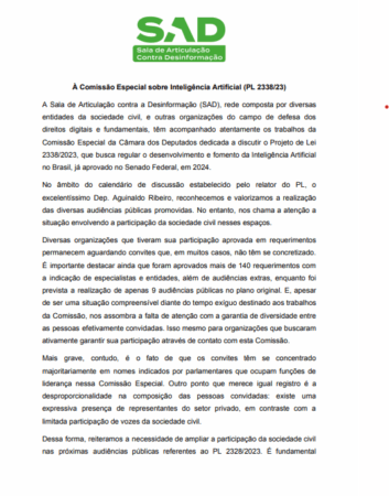 As organizações reunidas na Sala de Articulação contra Desinformação (SAD), rede dedicada ao enfrentamento da desinformação e de outras ameaças à integridade da informaç