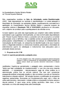 Nós, organizações reunidas na Sala de Articulação contra Desinformação (SAD) , rede especializada no combate à desinformação e a outras ameaças à integridade da informação nos ambientes digitais, respeitosamente, submetemos à apreciação do Excelentíssimo Senhor Ministro Relator o presente conjunto de sugestões relativas à Resolução TSE nº 23.610/2019 , atualmente em discussão, com o objetivo de contribuir para o aperfeiçoamento da referida norma.